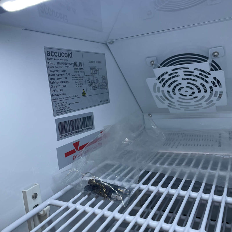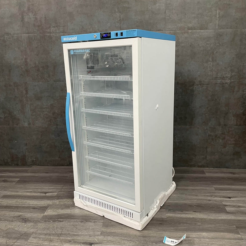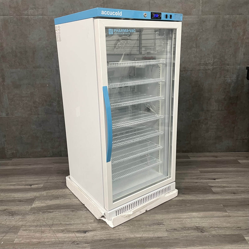 The Accucold ARG8PV Pharma-Vac refrigerator delivers exceptional medication and vaccine storage with its generous 8.0 cu.ft. capacity and visibility-enhancing glass door. Meeting strict CDC/VFC guidelines, this automatic-defrost unit maintains critical temperature precision while simplifying inventory monitoring. Perfect for pharmacies, hospitals, laboratories, and research facilities, it safeguards your valuable medical supplies with professional-grade reliability. Invest in protection that healthcare professionals trust for their most temperature-sensitive biological samples and pharmaceuticals.