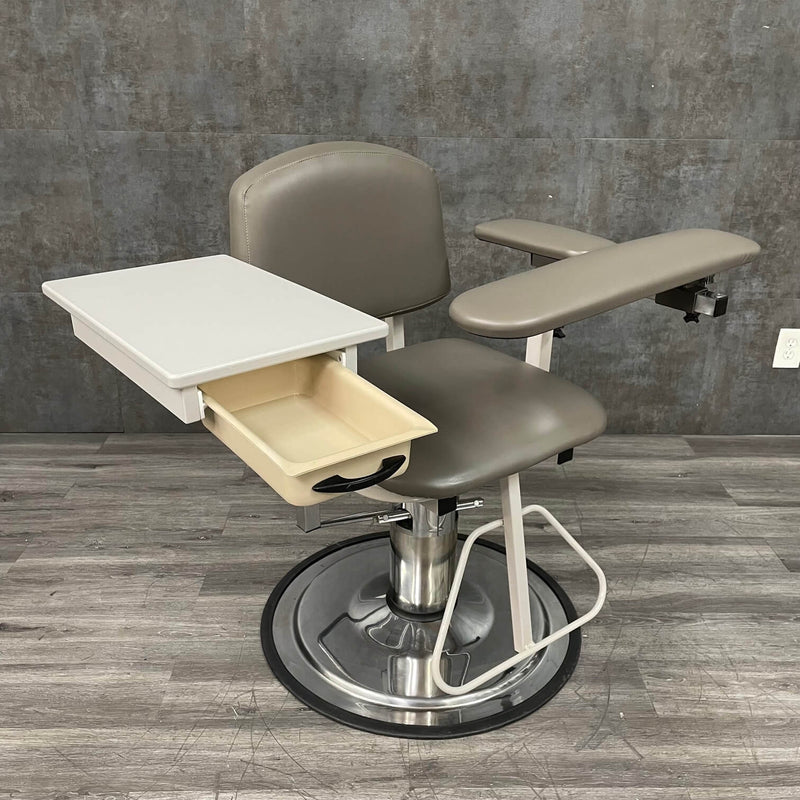 The Clinton H Series Padded Blood Drawing Chair with a robust all-welded tubular steel frame and thick foam cushioning to provide patients with stability and comfort during blood collection. Its padded flip arm securely locks in place for use and swings away smoothly for easy patient access. Equipped with a built-in drawer for convenient supply storage and hydraulic height adjustment, this chair supports efficient phlebotomy by allowing precise positioning to optimize vein access while minimizing practitioner strain. Designed for durability and functionality, it meets the demands of clinical environments.
